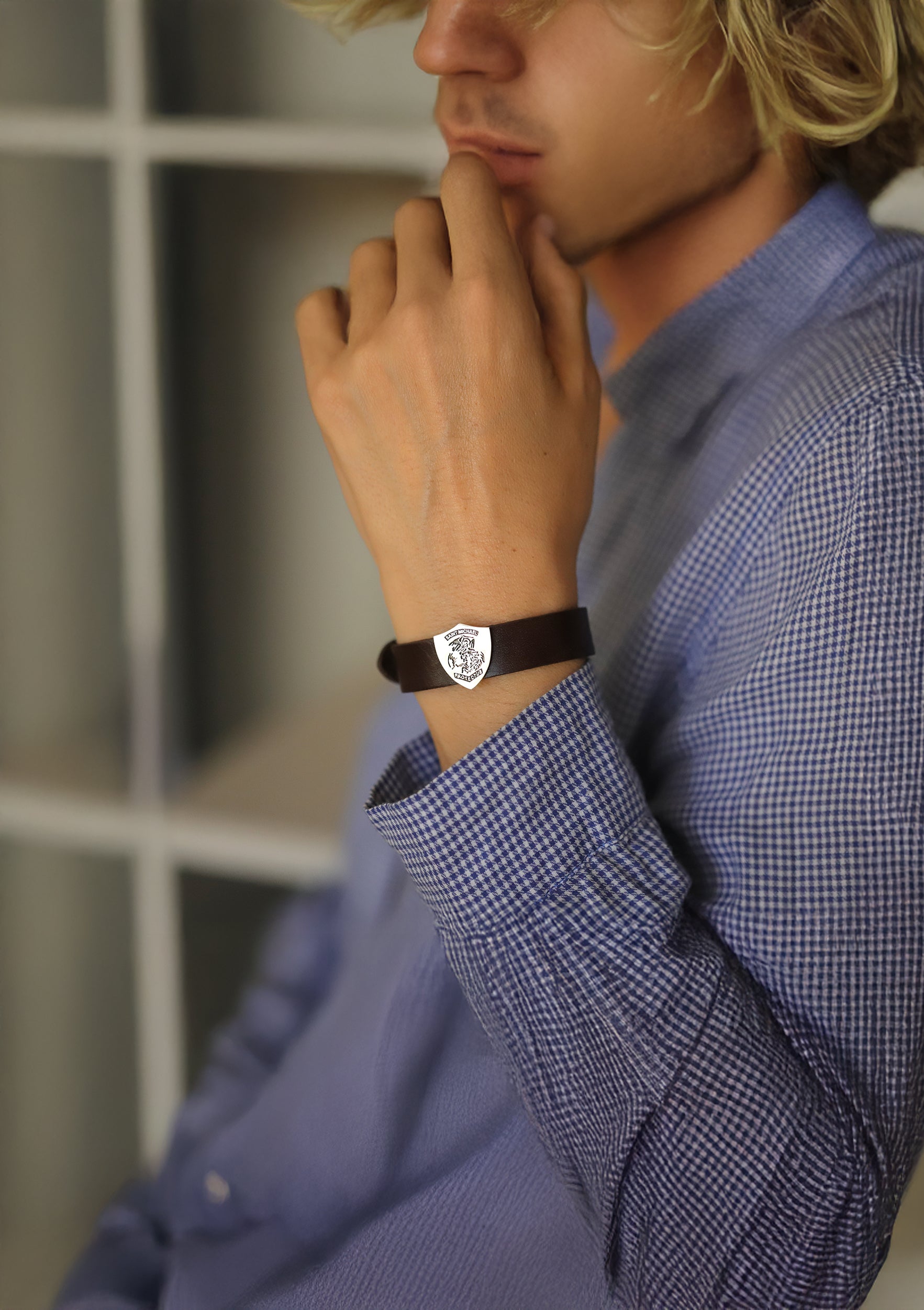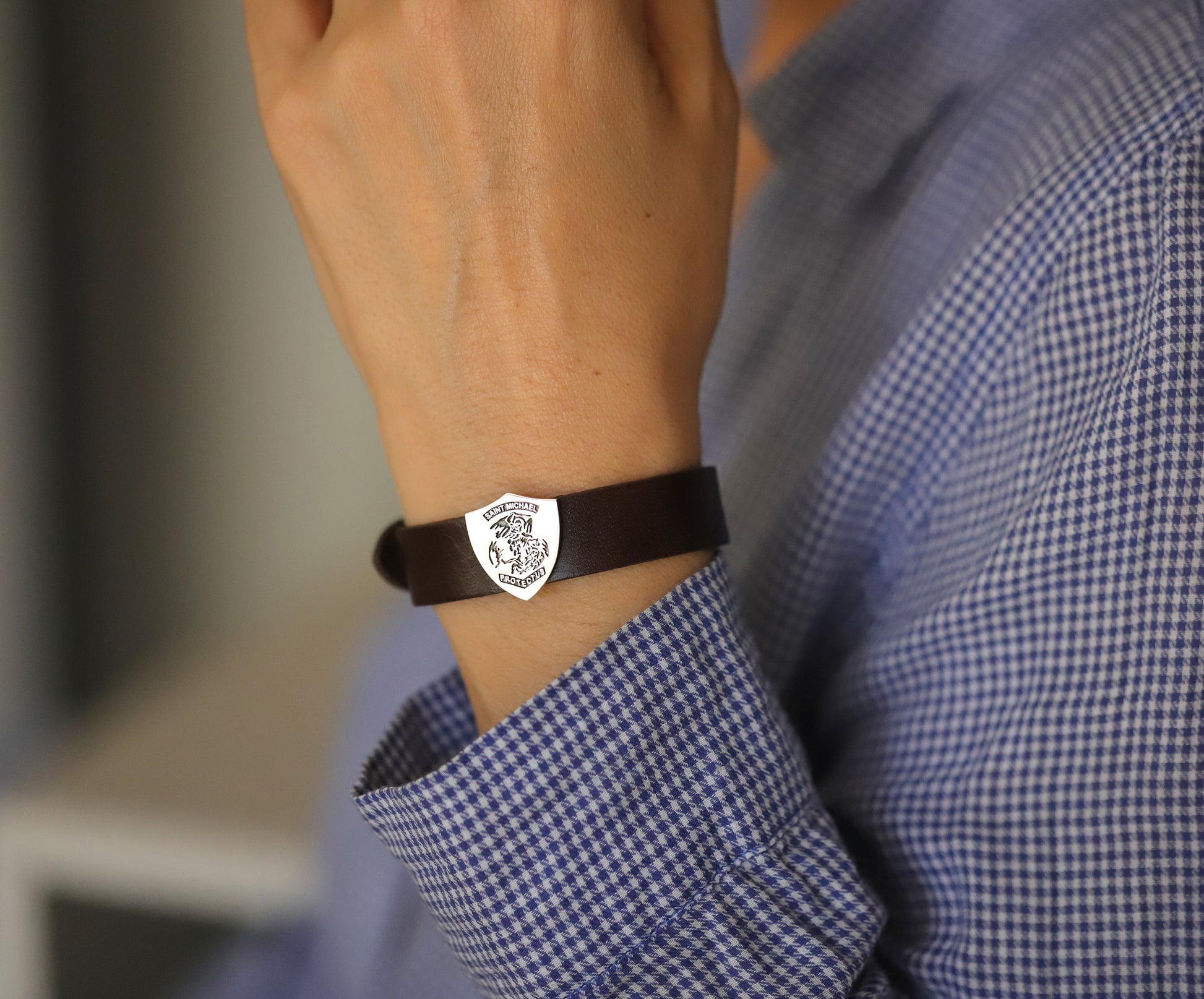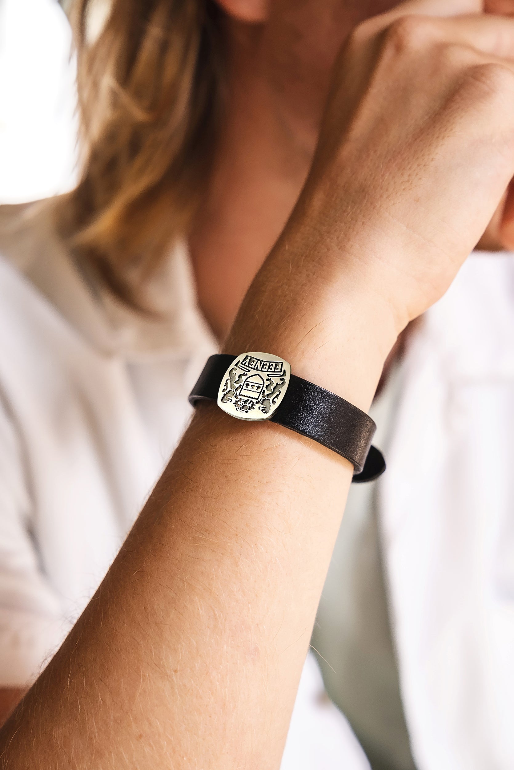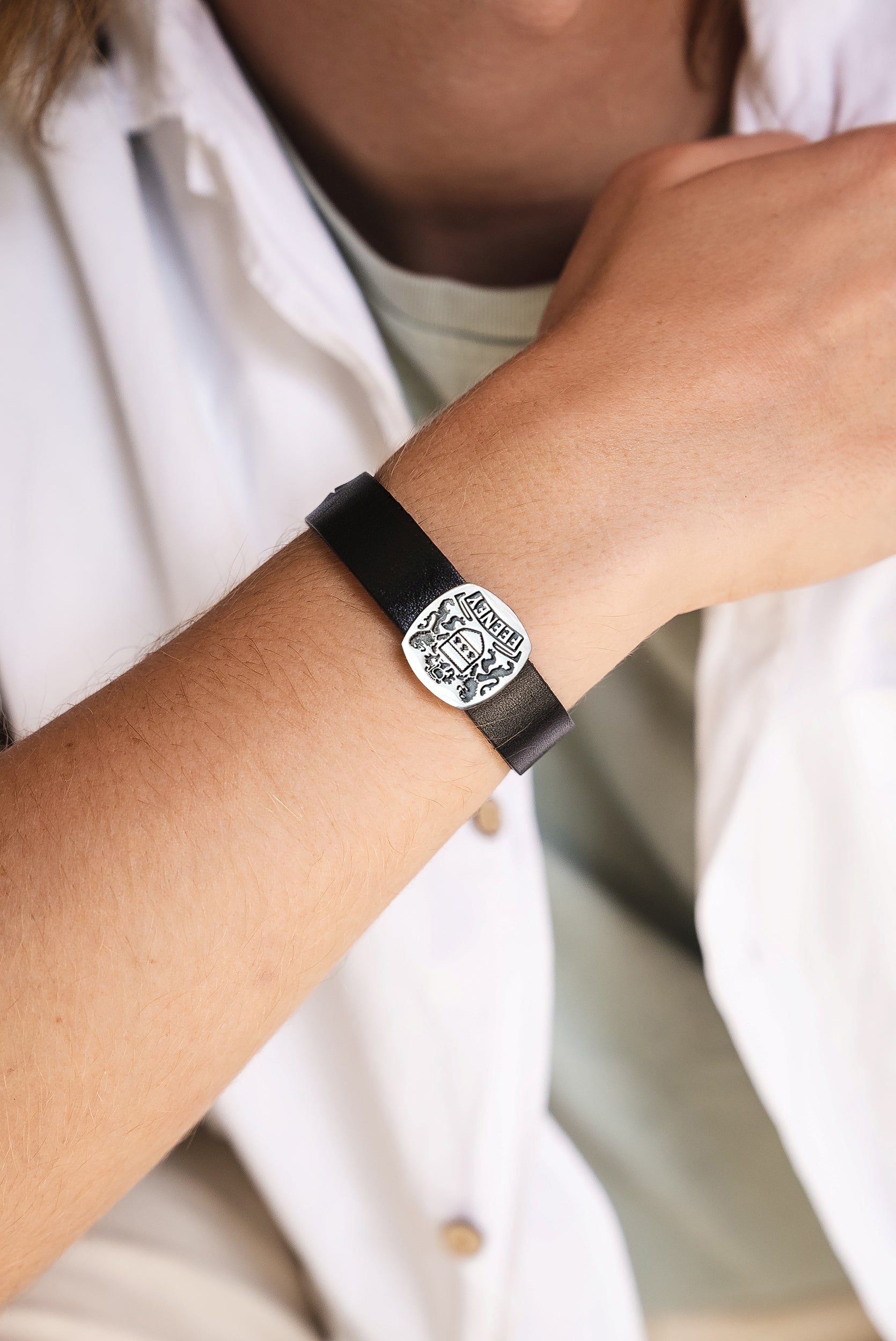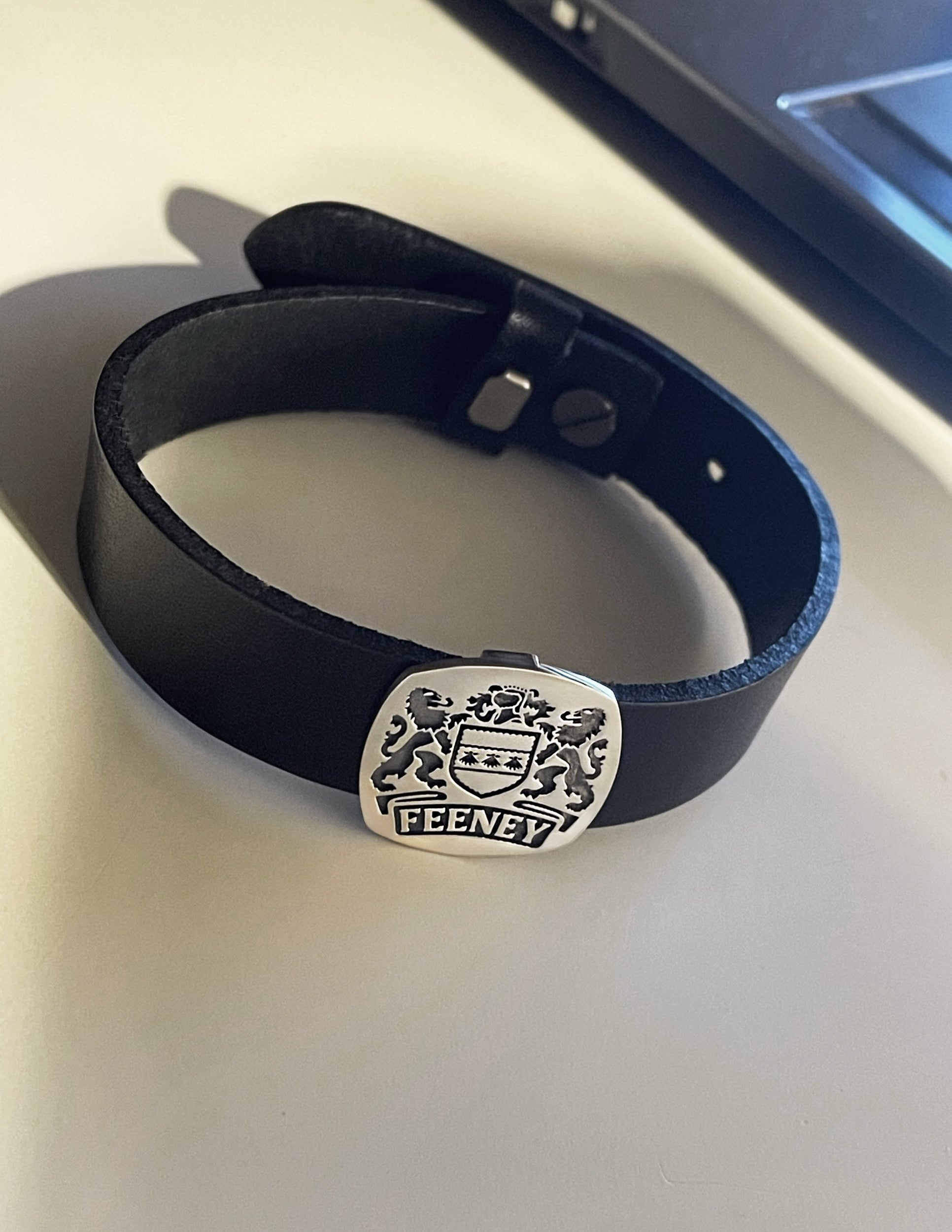 custom family crest men’s bracelet – sterling silver & leather