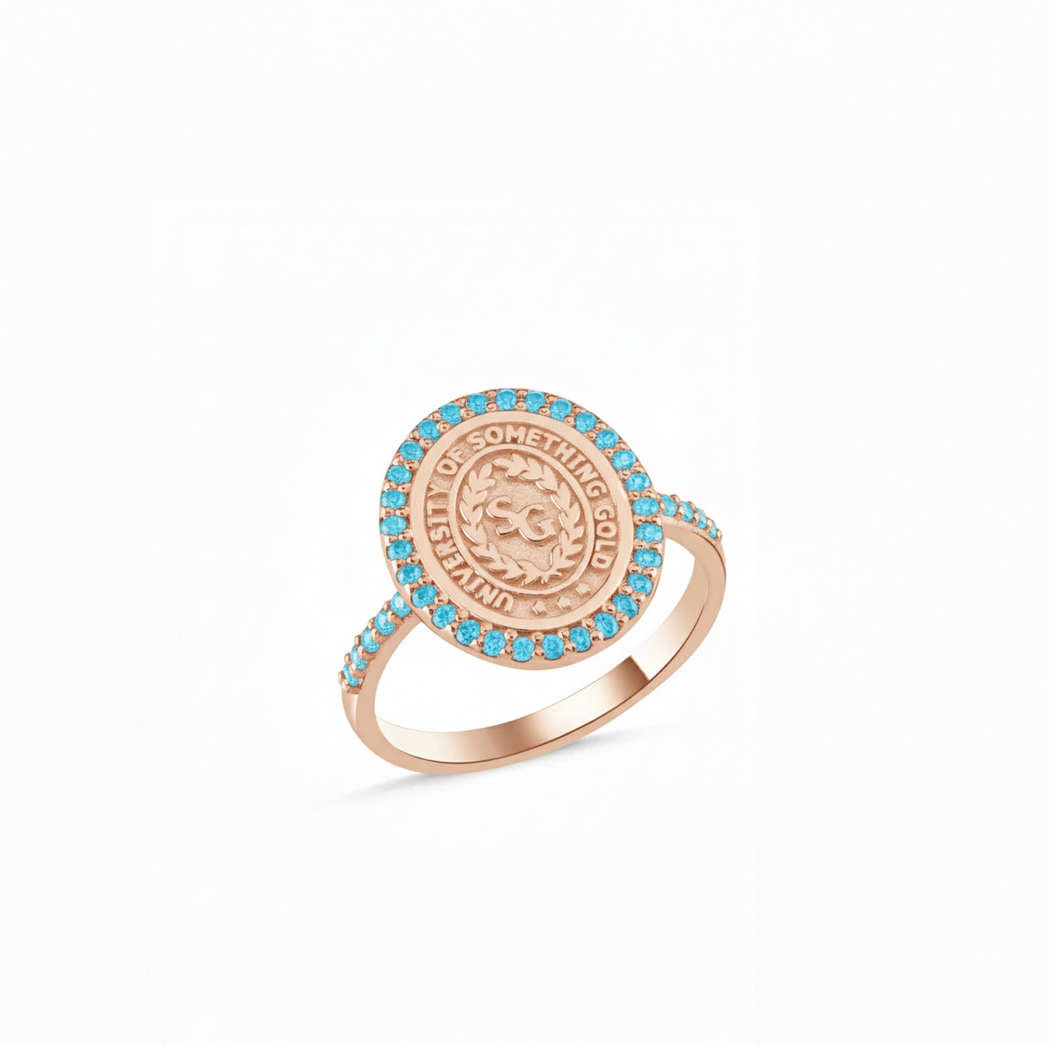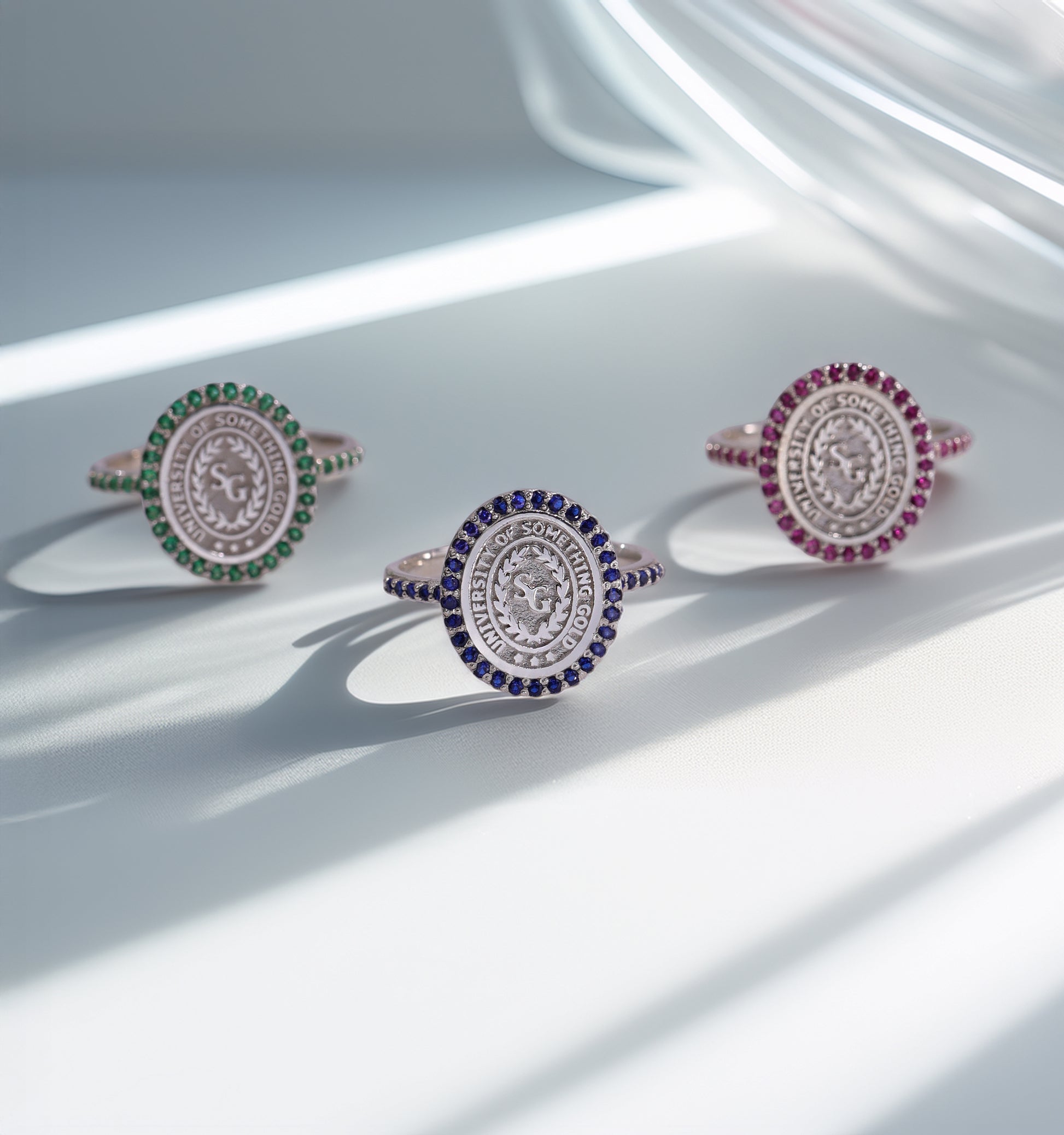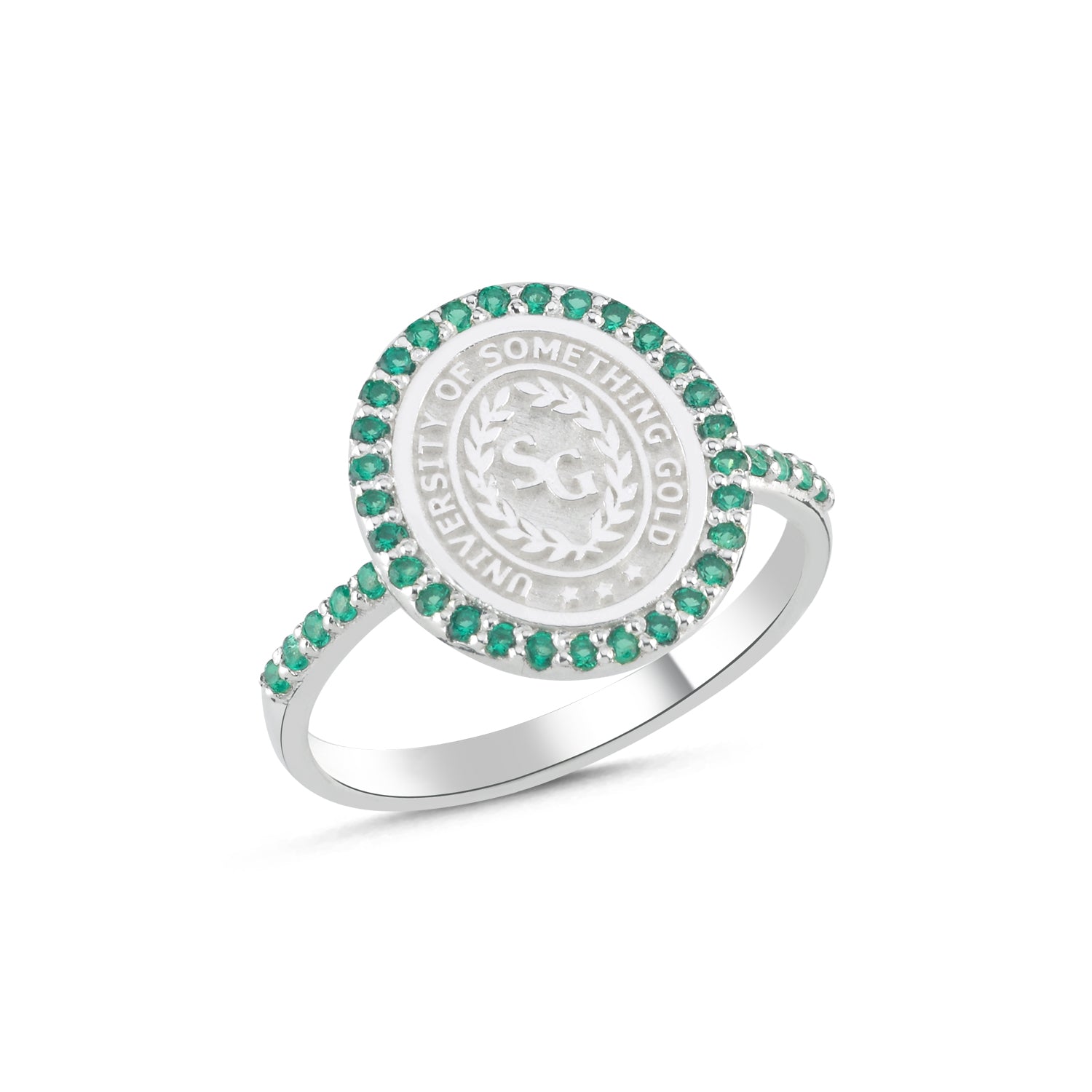 every ring is crafted specifically for you. the school logo is deeply engraved for longevity, and the halo stones are hand-set for maximum sparkle.