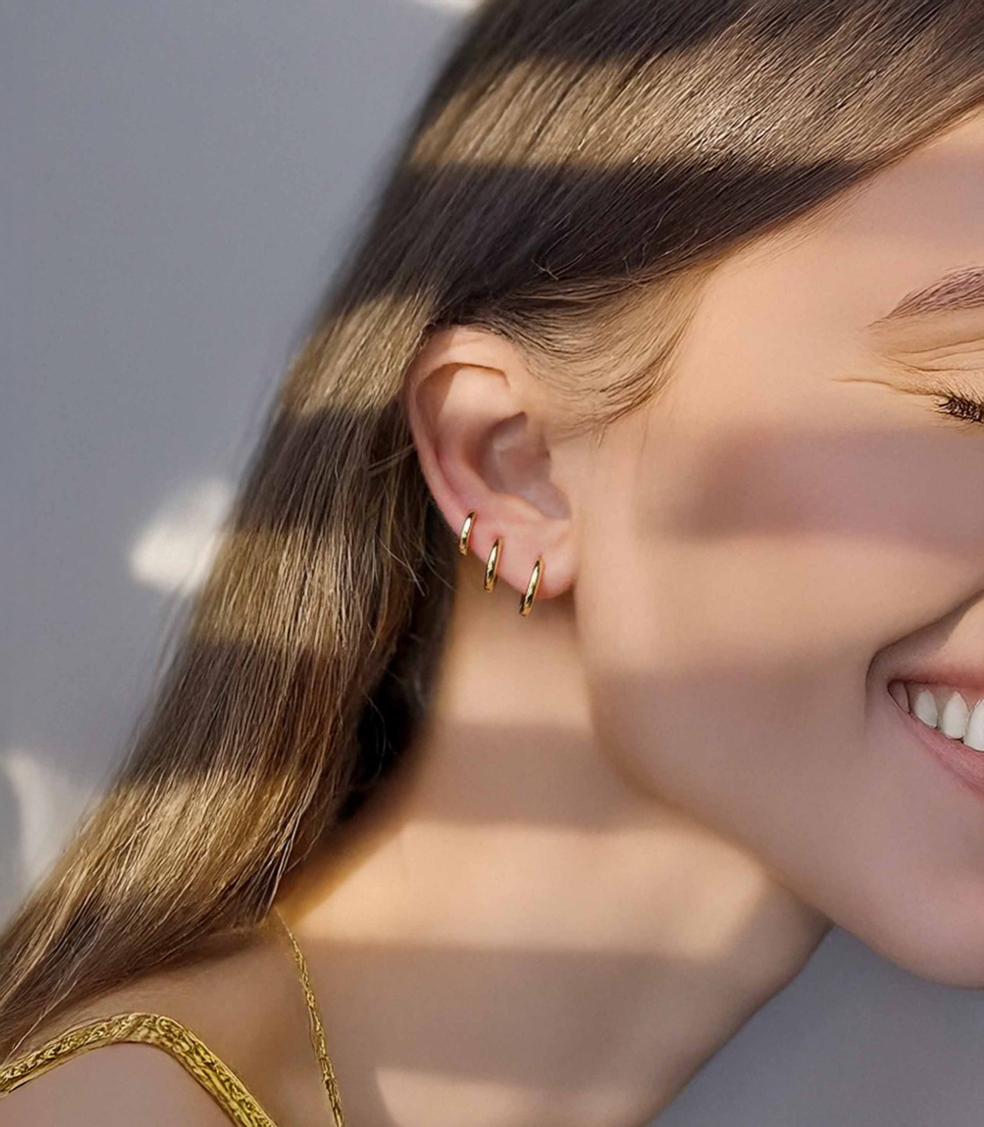 achieve the perfect ear stack with our dainty solid gold huggie hoops, available in three graduated sizes designed for 24/7 wearability and comfort. whether you're looking to wear it alone or the complete graduated look, these delicate gold huggie hoops are the ultimate everyday essential.